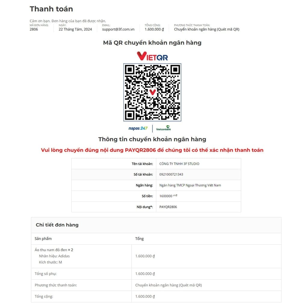 - Tự động tạo nội dung chuyển tiền chứa mã đơn hàng, dễ cho quản trị viên hoặc phần mềm xác nhận giao dịch thanh toán.